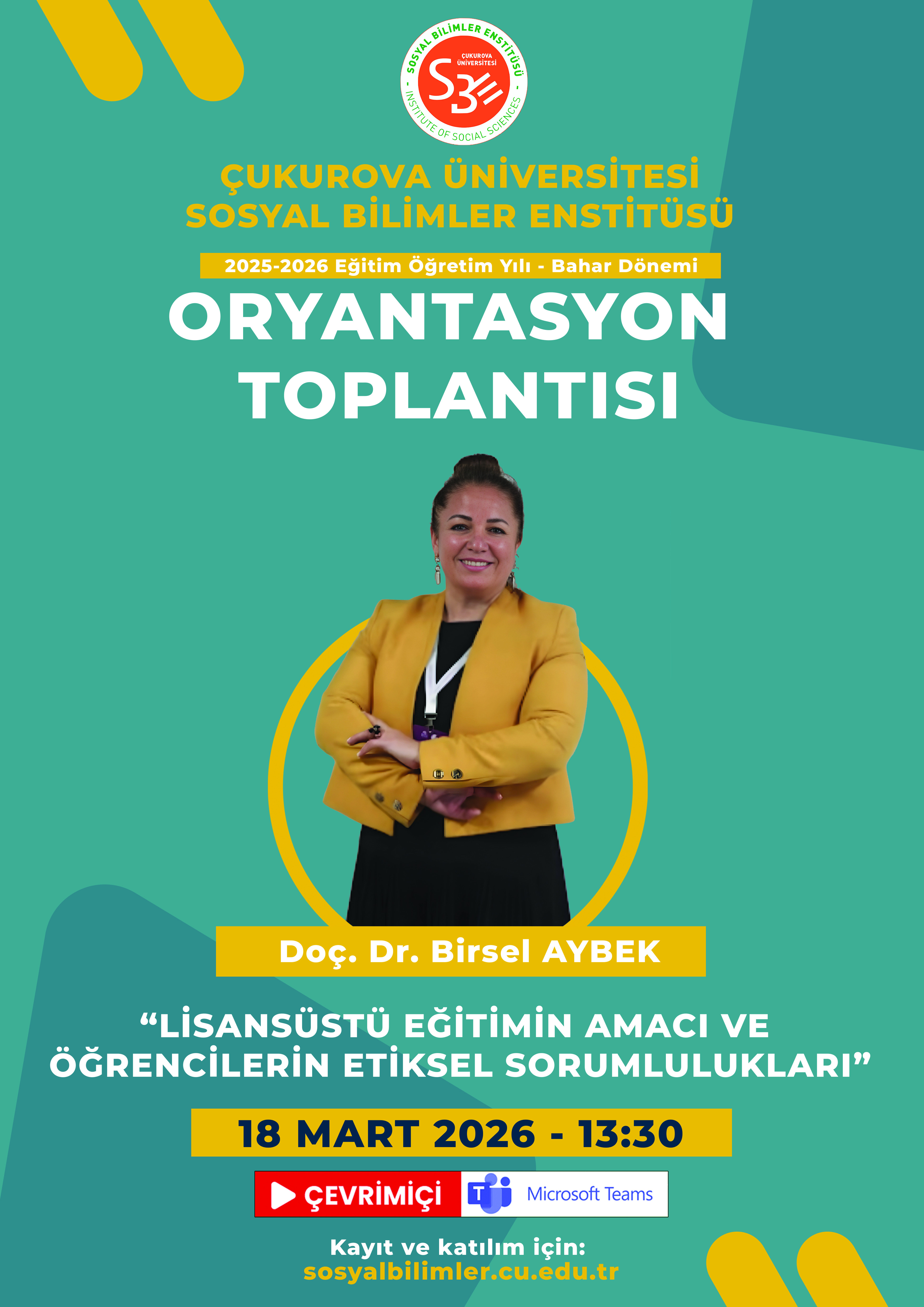 2025-2026 Bahar Yarıyılı Oryantasyon Programı çerçevesinde 11 Mart 2026 Çarşamba günü Saat 13:30’da Doç. Dr. Birsel AYBEK tarafından “Lisansüstü Eğitimin Amacı ve Öğrencilerin Etiksel Sorumlulukları” başlıklı çevrimiçi toplantı düzenlenecektir.